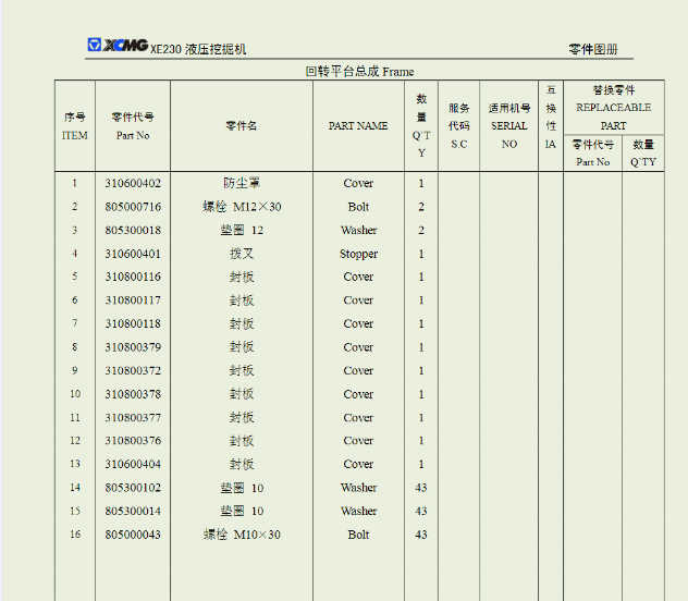 徐工XE230C液压挖掘机零件图册XCMG Excavator XE230C Parts Manual EN ZH